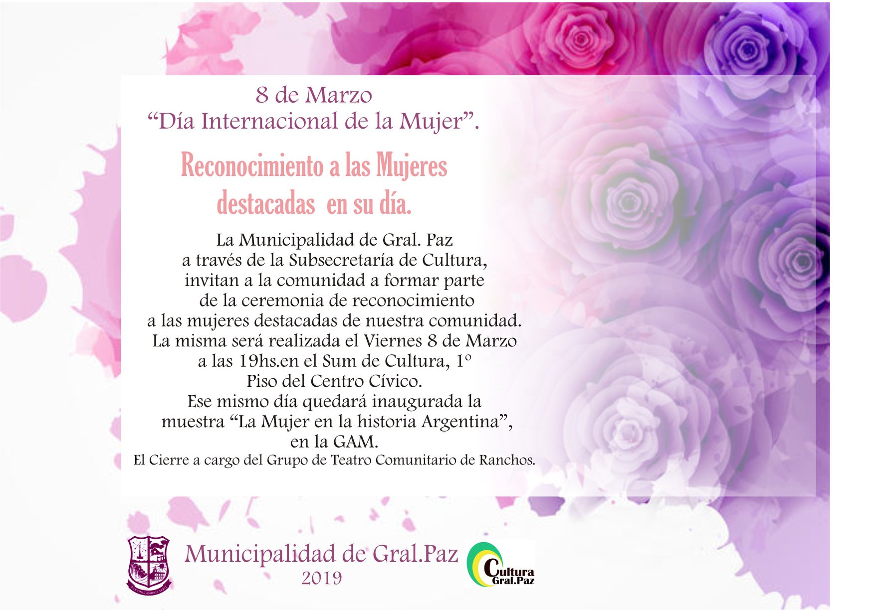 La Municipalidad de General Paz a través de la Subsecretaría de Cultura, invitan a la comunidad a formar parte de la ceremonia de Reconocimientos a las Mujeres Destacadas de nuestra Comunidad.