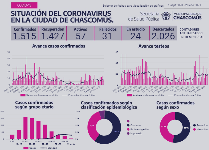 Se informó este Jueves 28 de enero, desde la Municipalidad, el estado de situación de la pandemia del Coronavirus en nuestro distrito, donde se registraron 8 nuevos casos positivos, sumando un total de 1515.