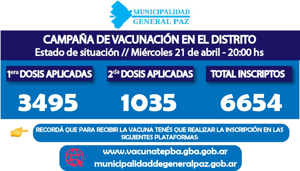 En este momento, más que nunca, apelamos a la conducta y responsabilidad individual y social. Para recibir la vacuna, recordá inscribirte en la plataforma www.vacunatepba.gba.gob.ar y completar la Declaración Jurada en el sitio web de la Municipalidad de General Paz.