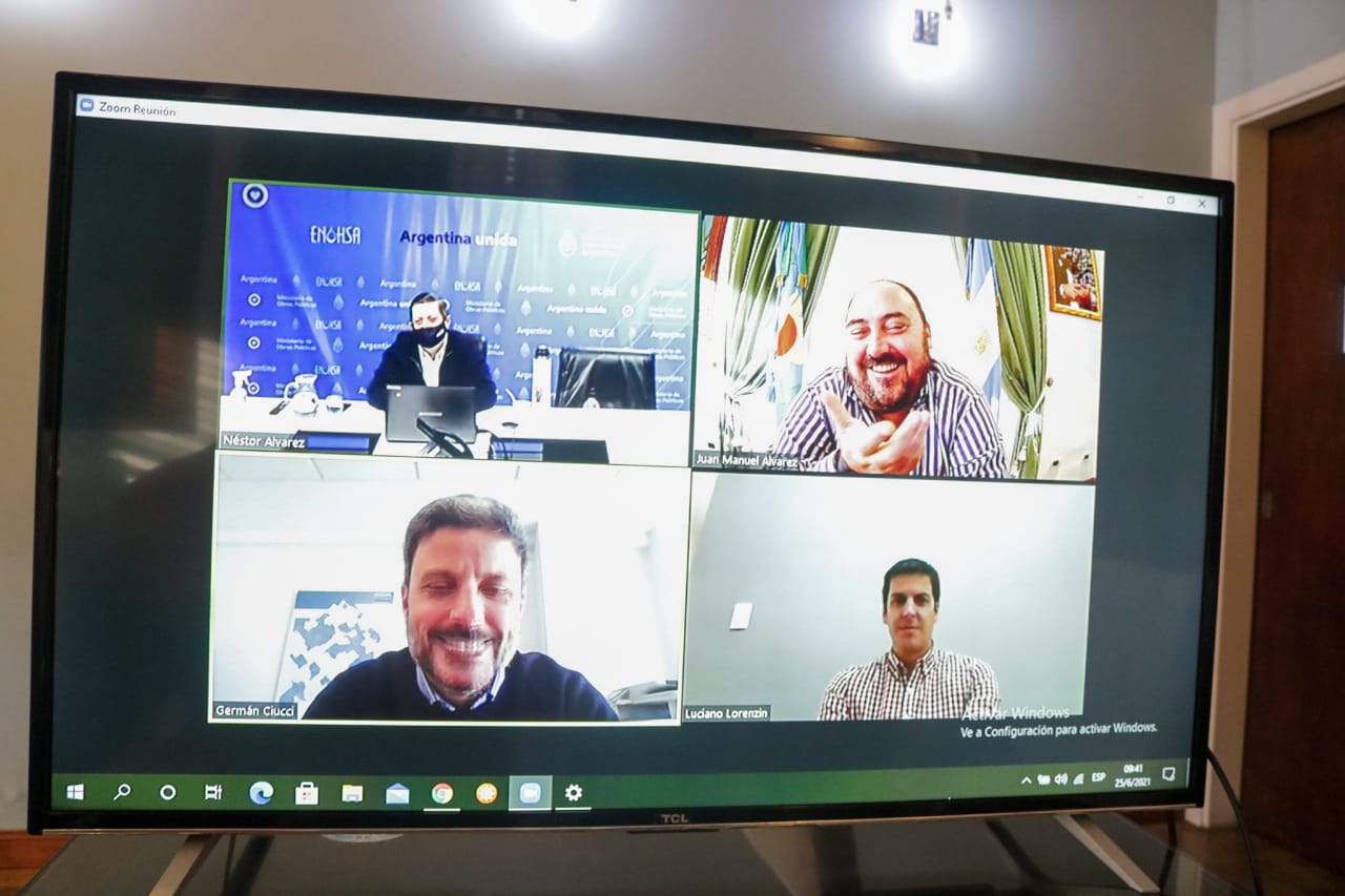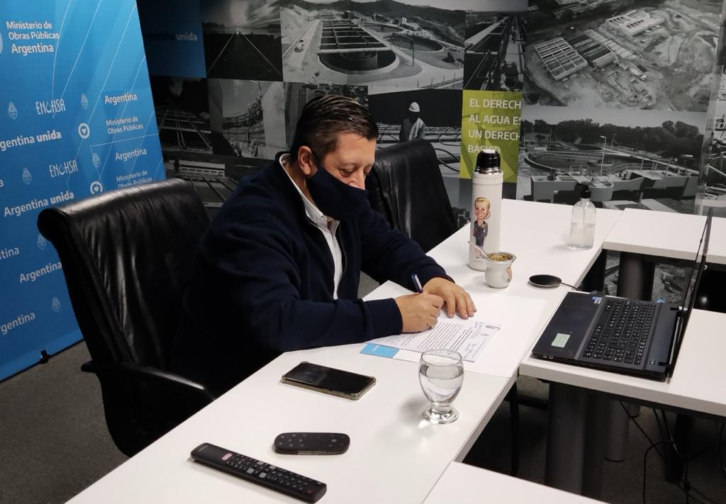 El Intendente Municipal Juan Manuel Alvarez, participó de un encuentro virtual junto al Subadministrador del Ente Nacional de Obras Hídricas de Saneamiento (ENOHSA), el Presidente de ABSA, Germán Ciucci, y el Secretario de Obras Públicas y Privadas de la Municipalidad de General Paz, Arq. Luciano Lorenzín, en el que presenció la firma de un convenio que posibilitará la construcción de 3900 metros lineales de tendido cloacal para el barrios Néstor Kirchner y de Escuela N°2.