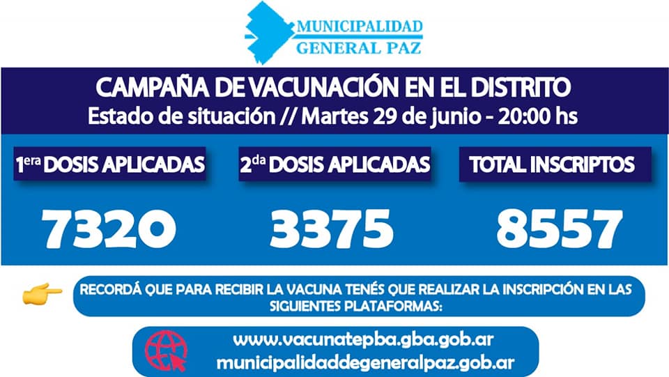 A partir de mañana, la vacunación es libre y pueden recibir la primera dosis sin turno previo todas las personas mayores de 50 años, personal de educación, de salud y seguridad, y adultos con factores de riesgo, con la acreditación correspondiente de su patología. Si todavía no te registraste, podés hacerlo en la plataforma del Gobierno de la Provincia de Buenos Aires www.vacunate.gba.gob.ar y también completando la Declaración Jurada en el sitio web de la Municipalidad de General Paz.