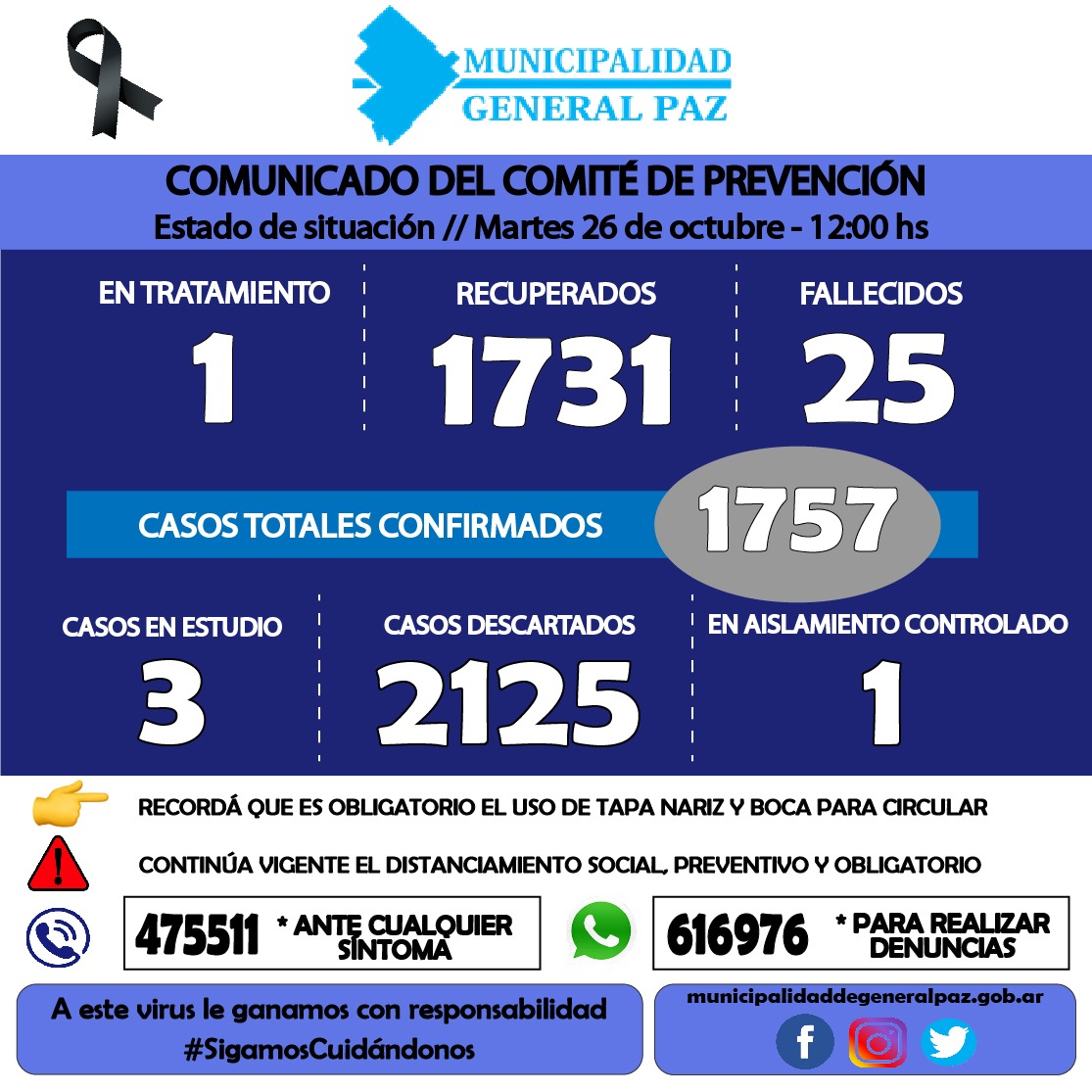 - 1 (un) caso que se encontraba en estudio fue descartado, arrojando resultado NEGATIVO de Covid-19.