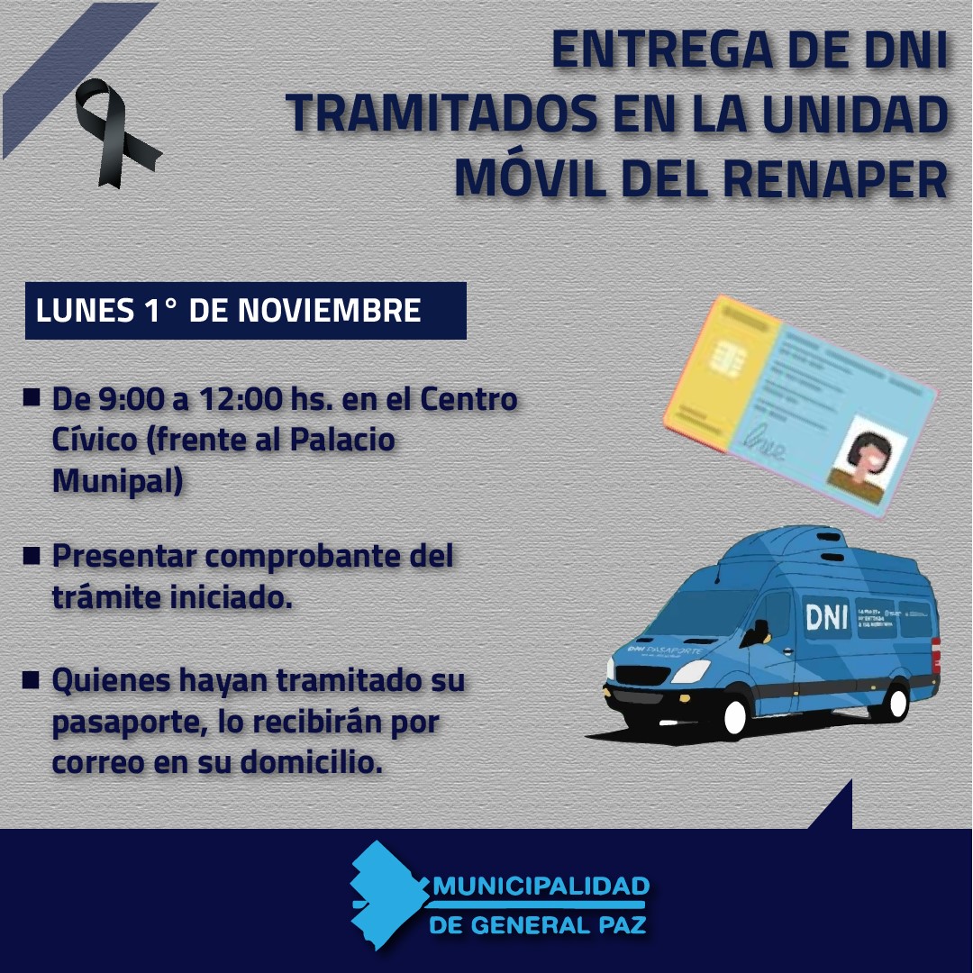 El próximo lunes 1° de noviembre, de 9:00 a 12:00 hs. en el Centro Cívico frente al Palacio Municipal, se llevará a cabo la entrega de los DNI tramitados el pasado lunes 18 de octubre en la unidad móvil del Registro Nacional de las Personas.