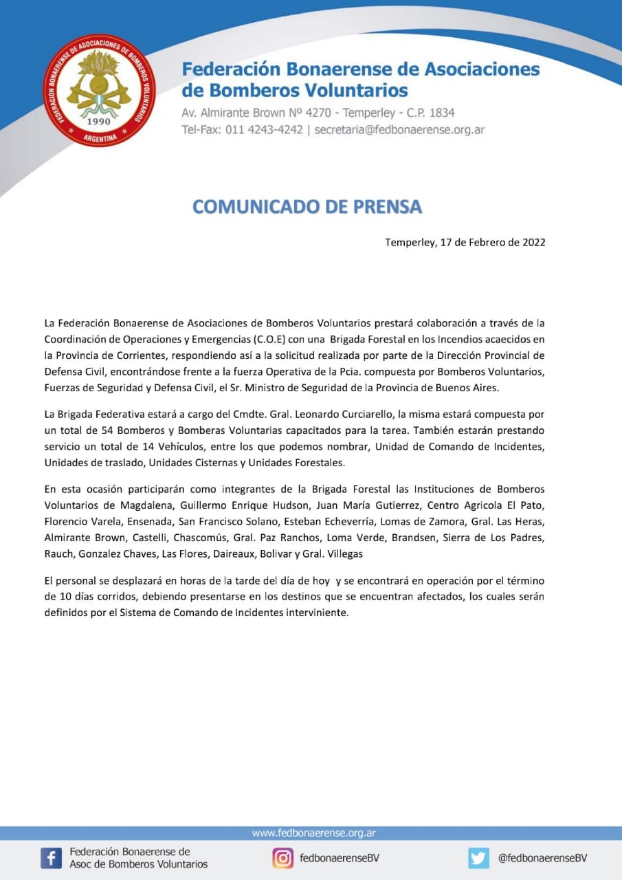 Los servidores públicos se encontraran en tierra correntina por el lapso de 10 días así lo manifestó la Federación Bonaerense de Asociaciones de Bomberos Voluntarios en el comunicado emitido en el día de hoy el cual adjuntamos