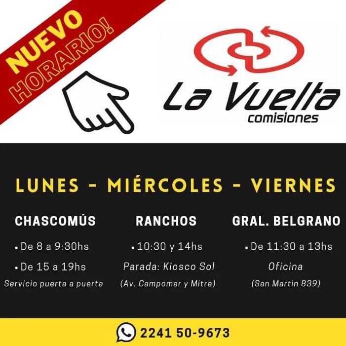 Actualidad Nuevos horarios de «COMISIONES LA VUELTA» 7 de marzo de 2022209 visitas 0 minutos de lectura Comisiones La Vuelta en su recorrido Chascomús – Ranchos – General Belgrano comunica sus nuevos horarios: