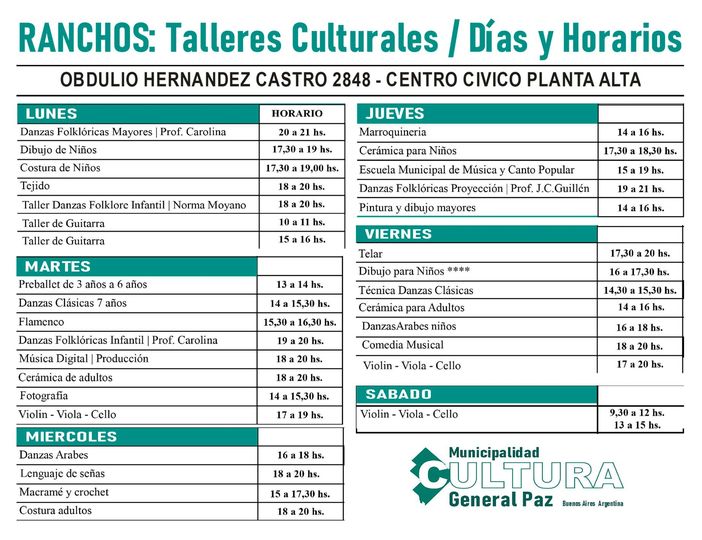 Actualidad Ranchos: Días y horarios de los Talleres Culturales 9 de marzo de 2022103 visitas 0 minutos de lectura La Secretaría de Cultura de la Municipalidad de General Paz informa los días y horarios de los Talleres Culturales a dictarse en Ranchos durante el 2022.