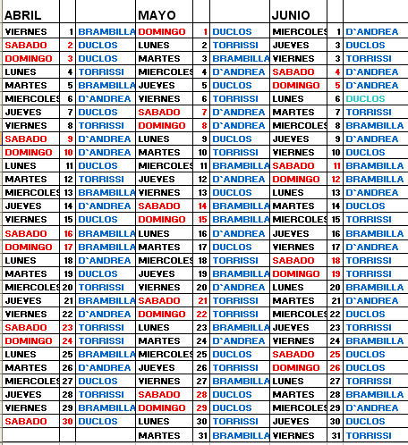 | SABADO | 16 | BRAMBILLA | LUNES | 16 | D`ANDREA | JUEVES | 16 | BRAMBILLA |
