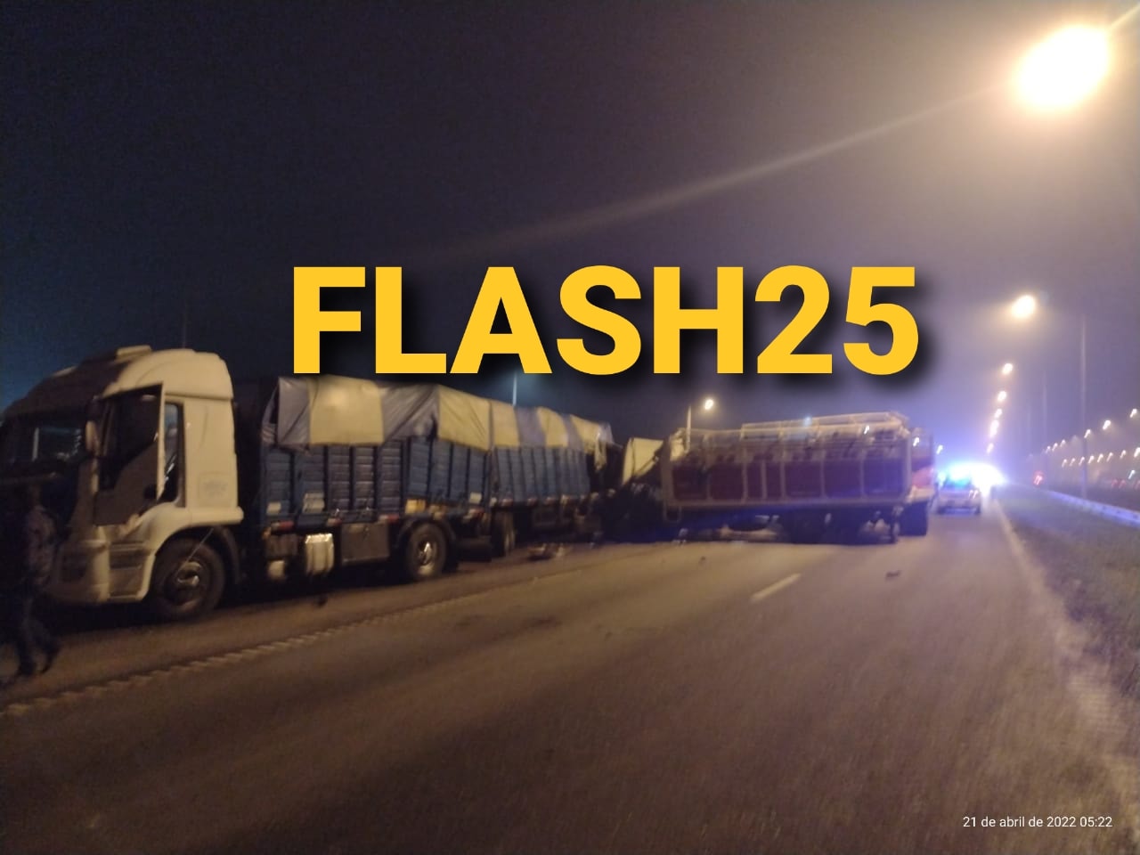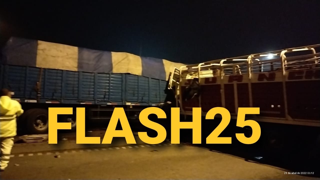ESTA MADRUGADA: Un camión Ford Cargo 1722 de color blanco, que arrastraba un semirremolque cargado con hacienda, a raíz de una mala maniobra o distracción (aún se despliegan los peritajes), impactó contra un camión Iveco, con un semirremolque que trasladaba verduras. FLASH25 supo que ambos rodados quedaron sobre la calzada, por lo tanto, el tránsito se mantiene cortado en ambos carriles, desviándose por el puente de Dámaso Valdés hacia la colectora.