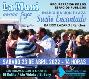 Actualidad Se inaugura éste sábado la Plaza «Sueño Encantado» 22 de abril de 2022148 visitas 0 minutos de lectura Este sábado a las 14 horas quedará inaugurada la Plaza «Sueño Encantado» en el barrio Lázaro. Estarán actuando «El Kelito», Ale Videla y El Bery. Invita la Municipalidad de General Paz