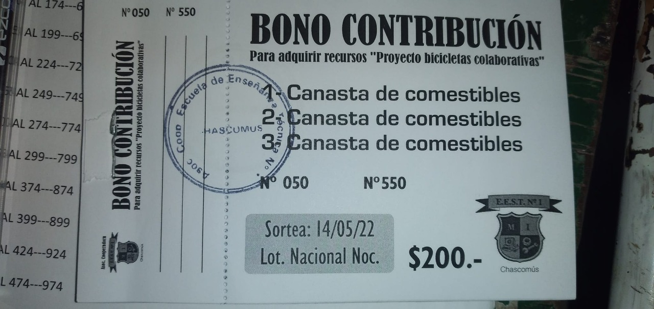 Con un valor de $200 cada uno, habrá tres premios que serán canastas de comestibles. Se sorteará el 14 de mayo de 2022 por la Lotería Nacional Nocturna y se podrán adquirir en la cooperativa de la Escuela Técnica Nº 1, ex Industrial, acudiendo hasta la institución o contactándose con la docente a cargo al 2241-580125.