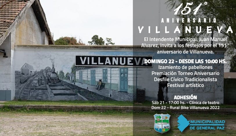 El próximo jueves 19 de mayo, la localidad de Villanueva celebrará su 151° Aniversario fundacional. La Municipalidad de General Paz invita a los vecinos y vecinas a participar de los festejos que tendrán lugar durante el fin de semana, con actividades deportivas, culturales, el Desfile Cívico-Tradicionalista y un festival artístico con una atractiva grilla de intérpretes.