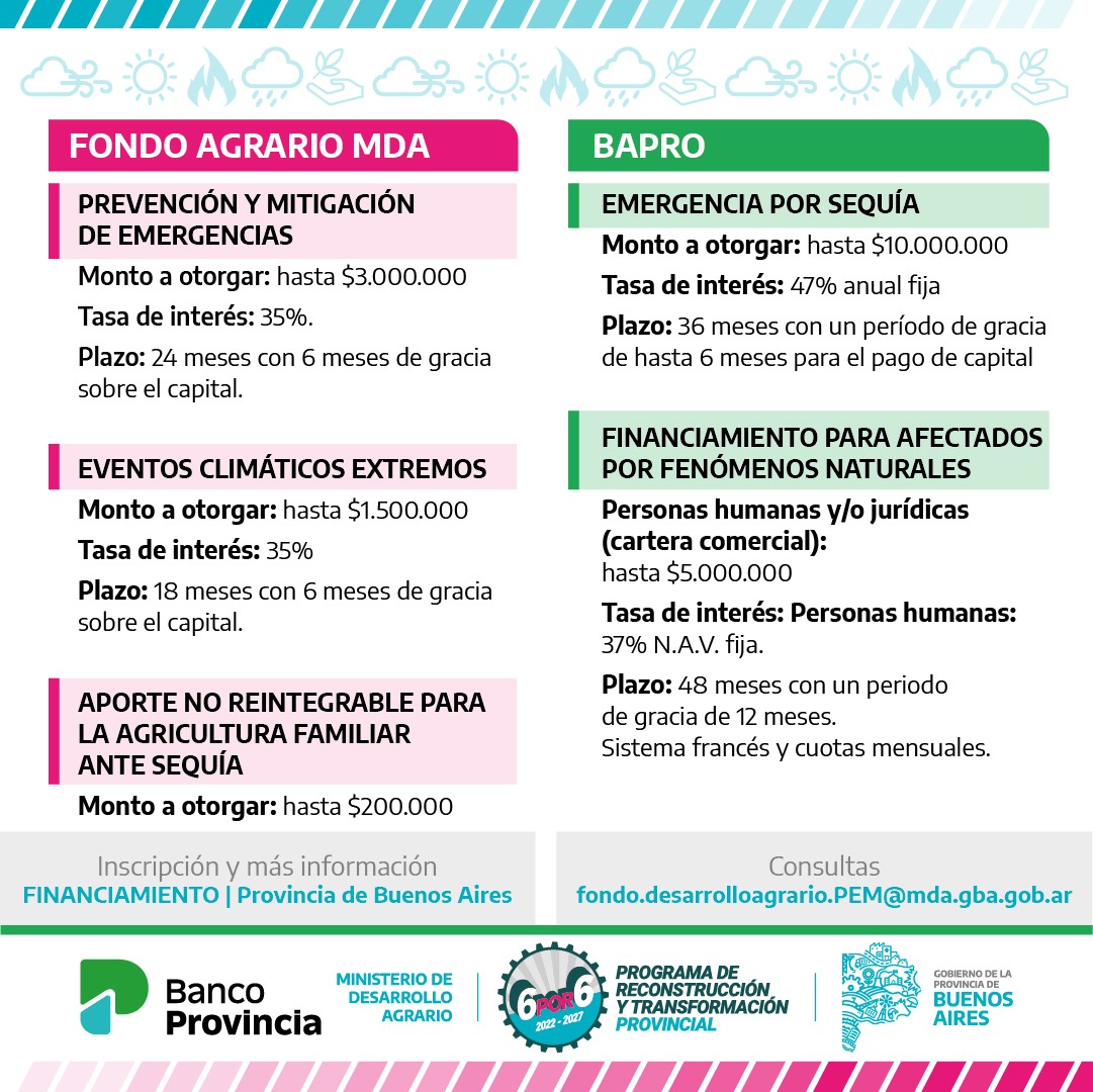 De este modo, el Ministerio de Desarrollo Agrario provincial y el Banco de la Provincia de Buenos Aires, establecieron diversas líneas de financiamiento que van desde aportes no reembolsables para la adquisición de fardos y rollos hasta créditos a tasas accesibles para mitigación de la emergencia.