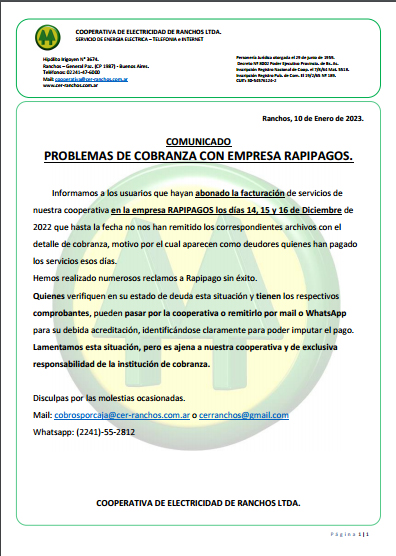 Cooperativa de Electricidad de Ranchos Ltda.: PROBLEMAS DE COBRANZA CON EMPRESA RAPIPAGOS.