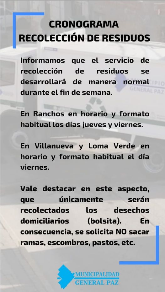 Actualidad Municipalidad de General Paz: Recolección de Residuos durante el feriado de Semana Santa 6 de abril de 2023108 visitas 0 minutos de lectura La Municipalidad de General Paz informa sobre la Recolección de Residuos en el feriado por Semana Santa: