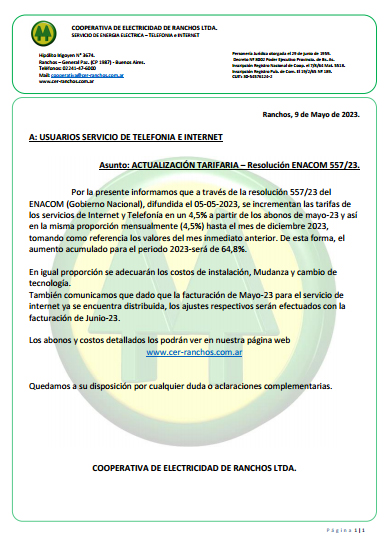 Cooperativa de Electricidad de Ranchos Ltda.: A USUARIOS SERVICIO DE TELEFONÍA E INTERNET: ACTUALIZACIÓN TARIFARIA – Resolución ENACOM 557/23.