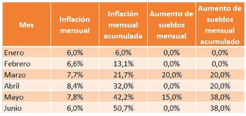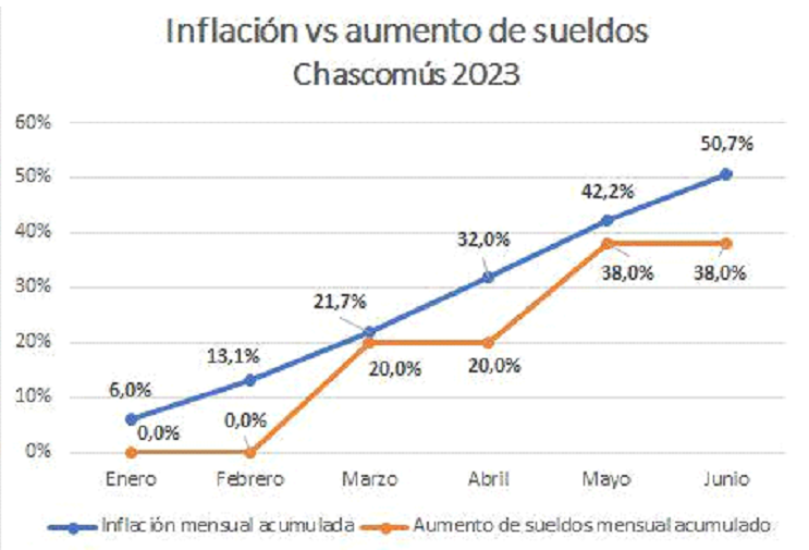 Según los datos oficiales del INDEC la inflación de junio 2023 fue 6,0%, siendo la acumulada del 2023 50,7% y la inflación anualizada (últimos 12 meses) 115,6%; en tanto como contracara el aumento de sueldos junio fue 0% y los aumentos acumulados del 2023, 38%.
