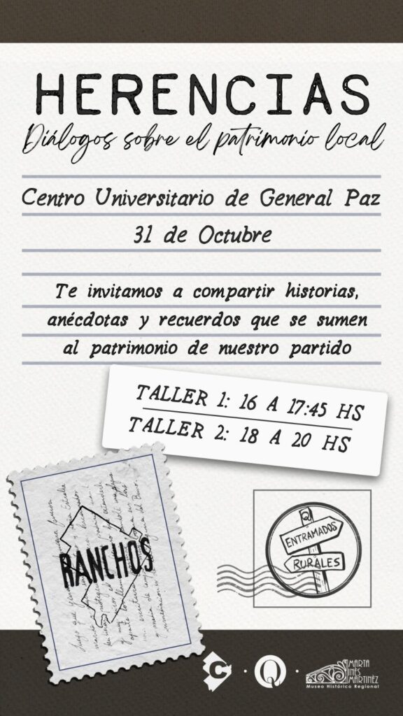 Invitamos a la comunidad en general: productores, emprendedores, docentes de escuelas rurales y urbanas, miembros de entidades agrarias, cooperativas y otras asociaciones, agentes vinculados al turismo rural y estudiantes (de todos los niveles) a compartir historias, anécdotas y recuerdos que se sumen a la recuperación del patrimonio de nuestro pueblo, participando de los talleres que se llevarán a cabo el día 31 de octubre, en el Centro Universitario de General Paz.