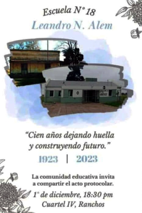 La comunidad educativa de la Escuela Nº 18 ubicada en el Cuartel IV de Ranchos, invita a compartir el acto protocolar el día 1º de diciembre a las 18,30 Hs.