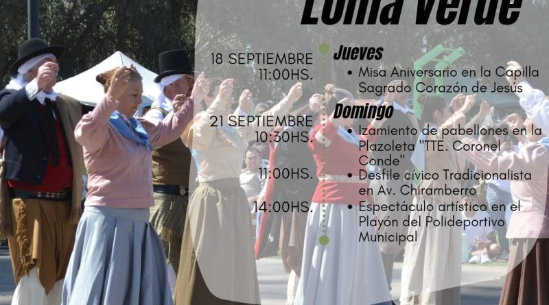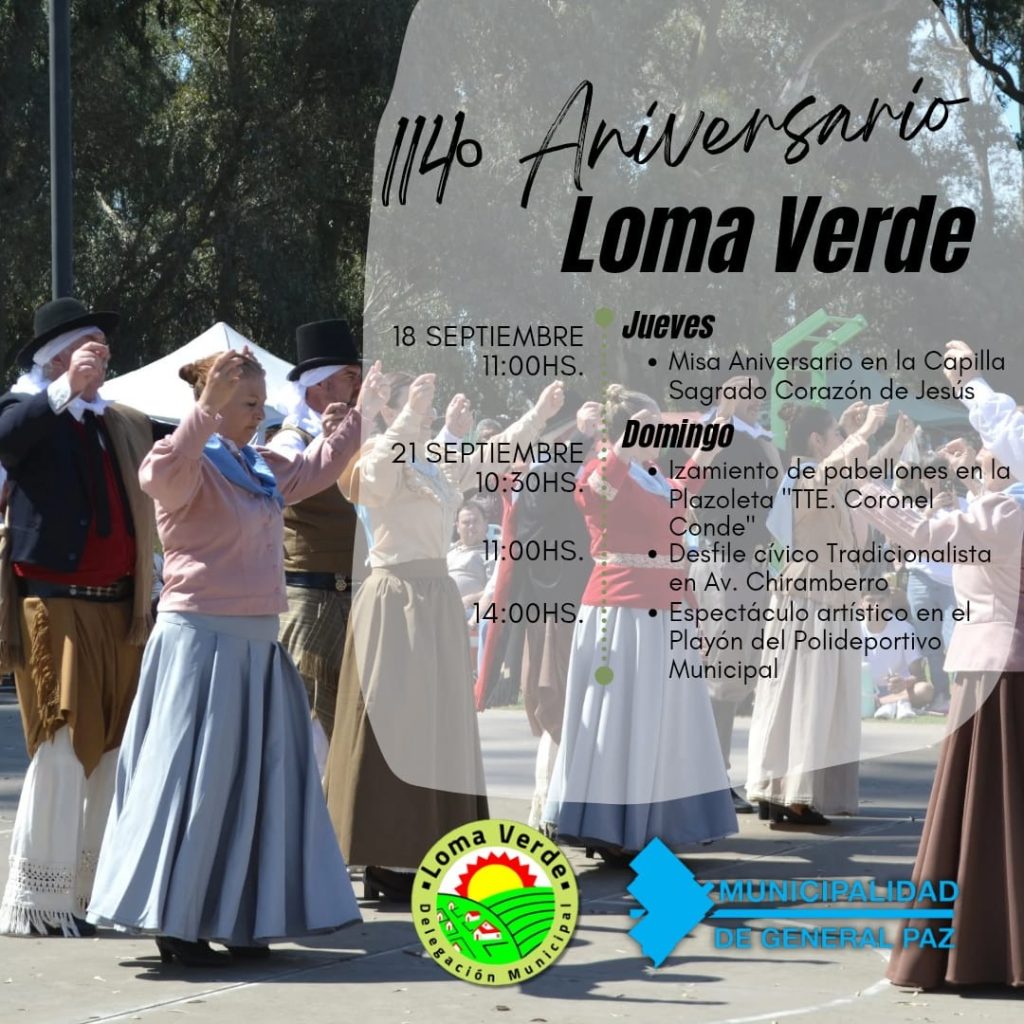 El Intendente Municipal Juan Manuel Alvarez conjuntamente con el Delegado Municipal, Marcelo Mendilahatzu, tienen el agrado de invitar a usted a participar de los actos programados con motivo de celebrarse 114º aniversario de la fundación de la localidad de Loma Verde.