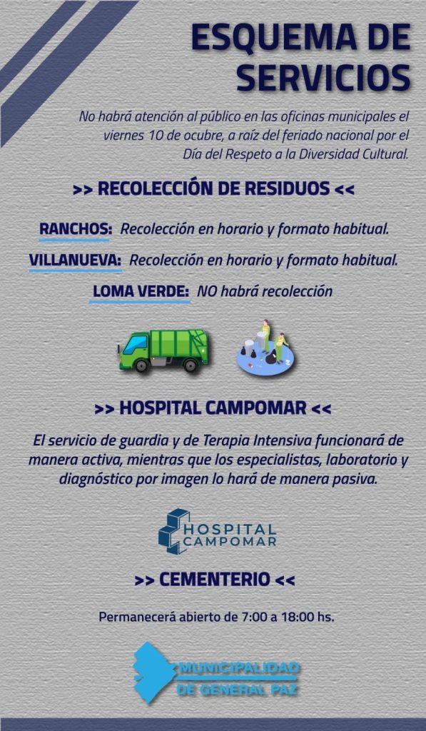 Actualidad Municipalidad de General Paz: Esquema de servicios de este viernes feriado 9 de octubre de 202519 visitas 0 minutos de lectura