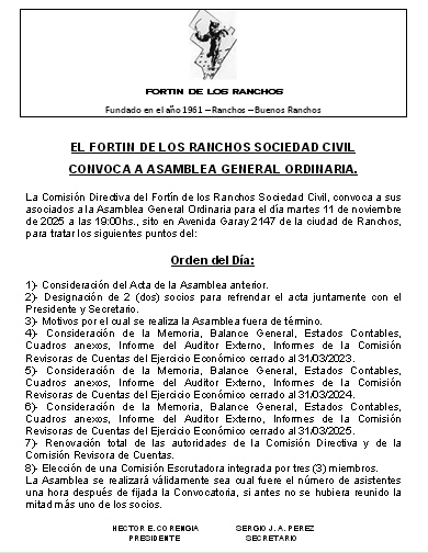 Actualidad Fortín de los Ranchos: Convocatoria a Asamblea General Ordinaria 29 de octubre de 2025139 visitas 0 minutos de lectura