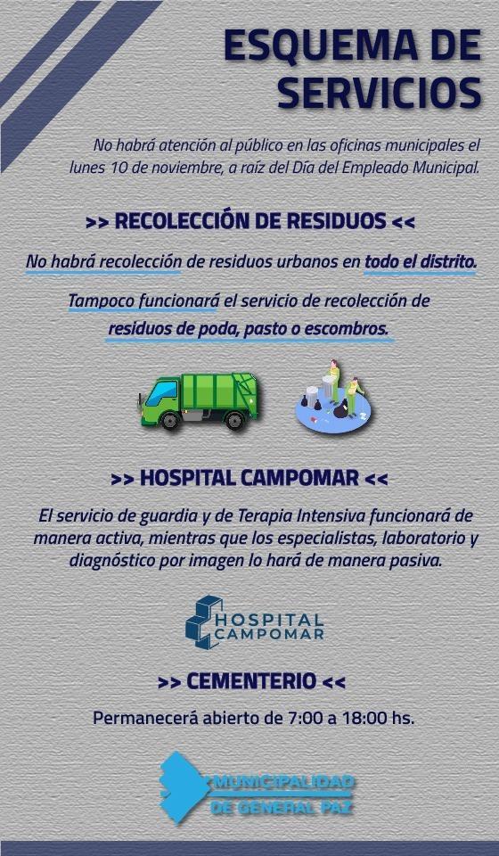 LA MUNICIPALIDAD DE GENERAL PAZ INFORMA SOBRE EL ESQUEMA DE SERVICIOS DEL DIA LUNES, FERIADO POR EL DIA DEL EMPLEADO MUNICIPAL, QUE ES ESTE SABADO Y SE TRASLADA AL LUNES.