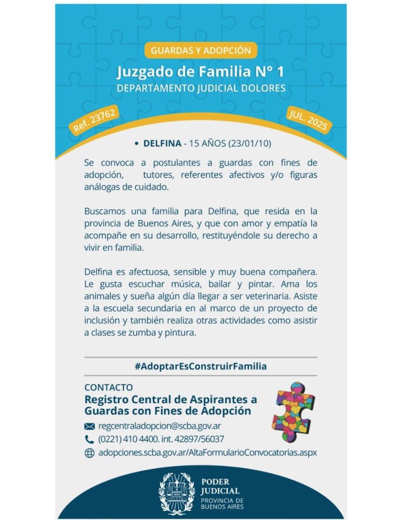 Les comparto un comunicado del Juzgado de Familia, convocando a postulantes a guarda con fines de adopción, en la búsqueda de una familia para Delfina.
