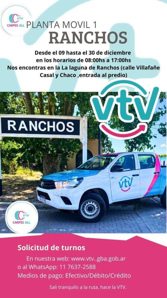 Ranchos: Del 9 al 30 de Diciembre llega la VTV móvil a nuestra ciudad.