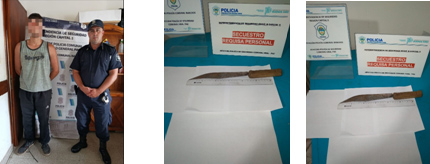 Se informa a los Medios de Comunicación Locales, que con fecha (20/12/2025) se procedió a la aprehensión de un sujeto masculino mayor de edad, domiciliado en esta ciudad, quien instantes previo había mantenido una pelea, con otro masculino, en el sector de la Plaza de Mayo, donde el aprehendido exhibía un cuchillo, motivo por el cuál se lo redujo y se incauto el cuchillo que exhibía y amenazaba a su oponente, quedando aprehendido por el delito de Lesiones Leves y Amenazas agravadas, tomando intervención la Ayudantía Fiscal Local.